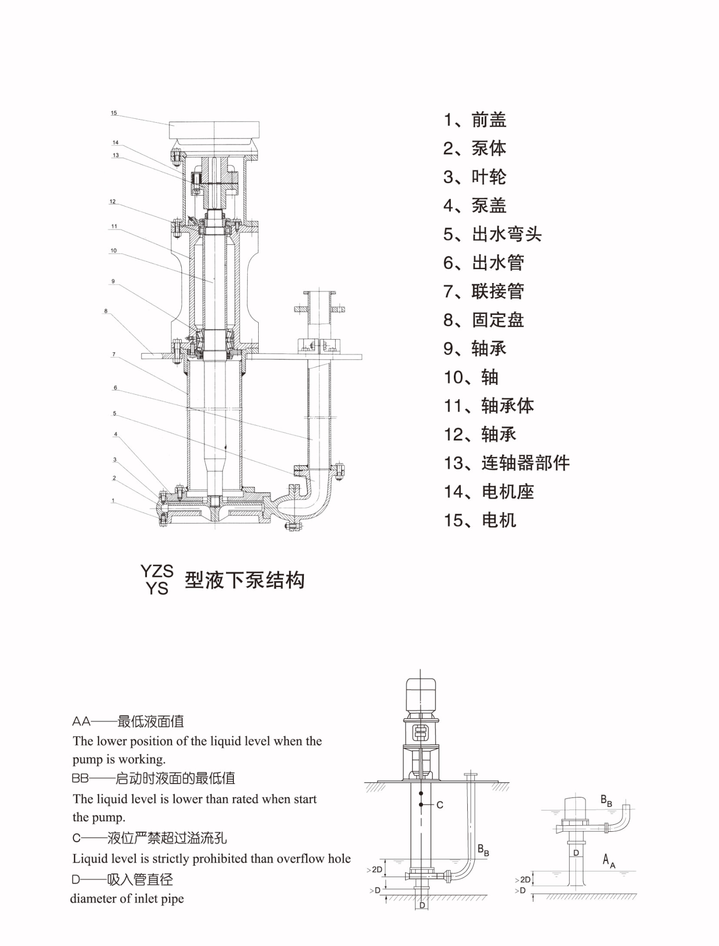 YS-YZS型泵为单级,单吸悬臂式结构,用轴承座,支承座,联接管连接泵的水力部件,液体由出液管部件排出,泵的叶轮为半开式叶轮,在叶轮叶片进口延伸处设有搅拌叶片,该泵主要特点是在液下部位的泵轴,有足够的刚度,叶轮,泵壳之间不设轴承,不采用轴封,可以输送含有较大浓度固体颗粒的介质。泵插入液下长度在 800MM-3000MM之间,如果需要可以配带吸入管。轴封采用液下泵插入液体中运行,不设轴封,传动由立式电动机安装在电机支承和支承座上,用联轴器与泵相连。渣浆泵配件,渣浆泵结构图,博泰渣浆泵。